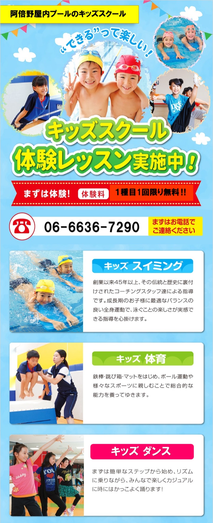 阿倍野屋内プールのキッズスクール無料体験 2026/01/13 水泳・体育・ダンスの3種目を1回無料でご体験いただけます! お子様の成長を促す人気の3種目です。 お申し込みはお電話で受け付けております。 一覧へ戻る ↑