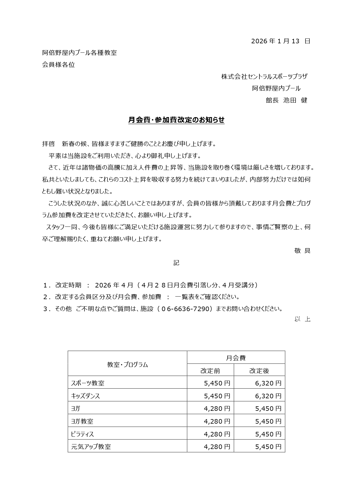 月会費改定のお知らせ