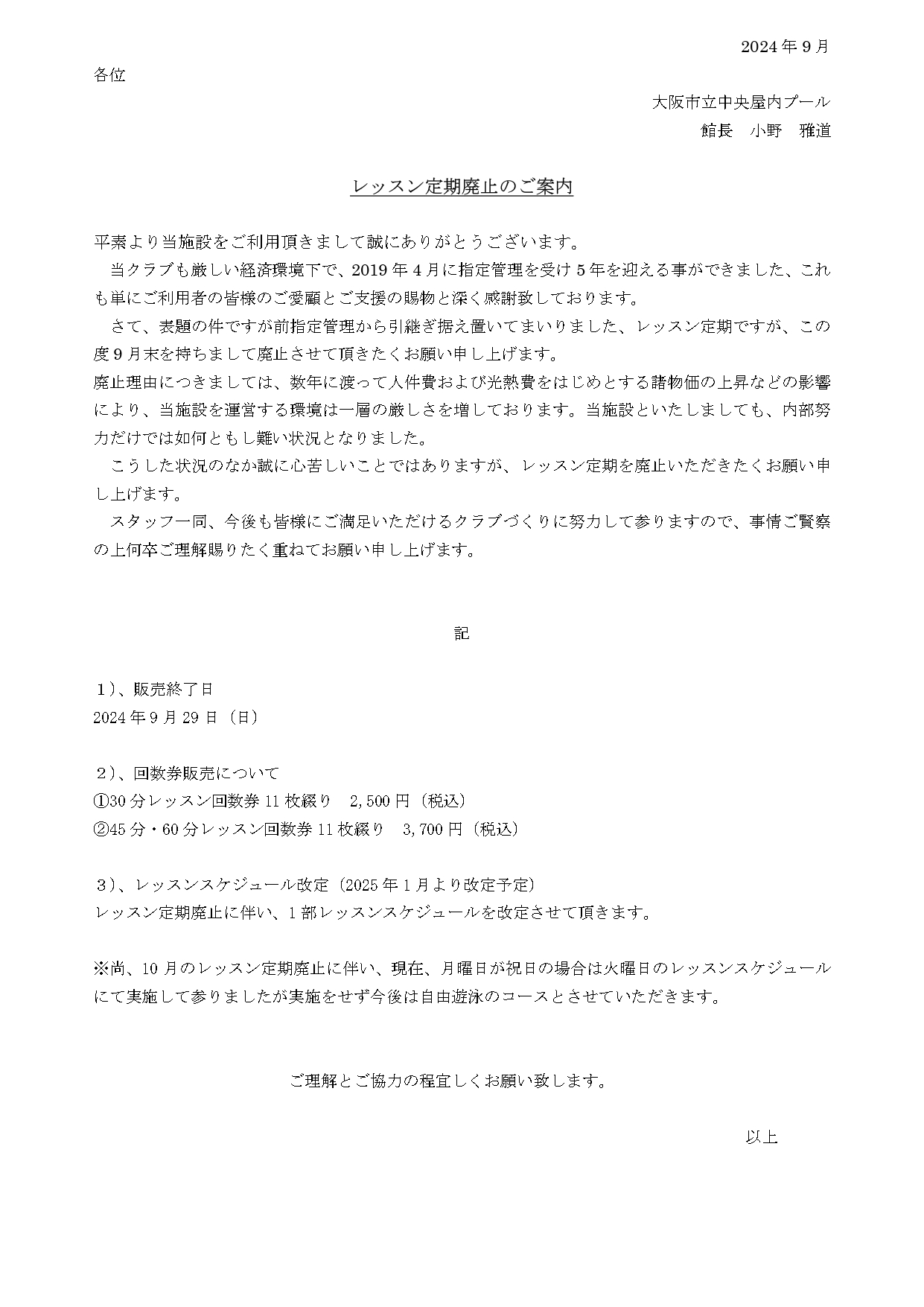 インフォメーション 【お知らせ】レッスン定期廃止のご案内 2024/11/01 1)販売終了日 2024年9月29日(日) 2)回数券販売 30分レッスン回数券11枚綴り 2,500円(税込) 45分・60分レッスン回数券11枚綴り 3,700円(税込) 3)レッスンスケジュール改定(2025年1月より改定予定) ご理解とご協力の程宜しくお願い致します。 一覧へ戻る