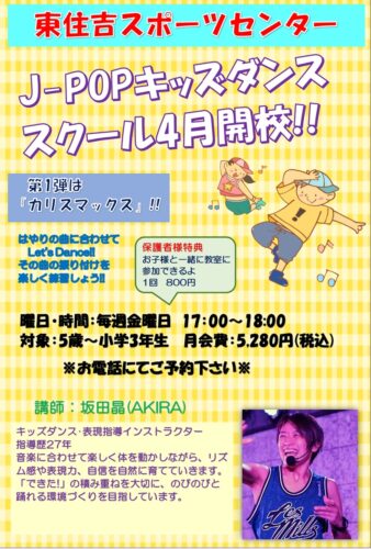 J-POPキッズダンス開校!! 2026/02/21 毎週金曜日 17:00~18:00 5歳~小学3年生 はやりの音楽に合わせてLet’sDance。楽しんでダンスを習得しよう。 無料体験実施中。この機会に是非。 一覧へ戻る ↑