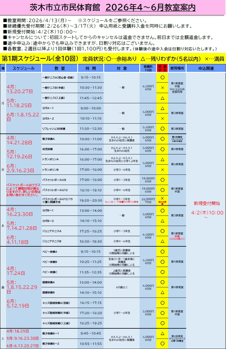 2026年度第1期(4~6月)の教室スケジュールのご案内です。