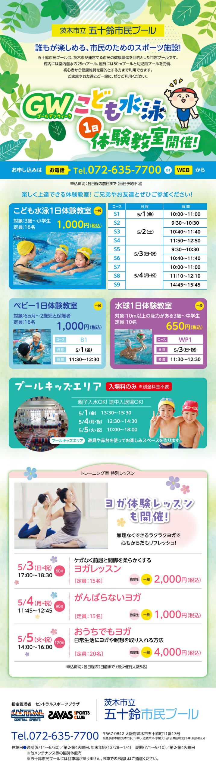2026年04月13日教室からのお知らせ 【こども・ベビー水泳教室】GW体験会 参加者募集中!※ヨーガイベントレッスンなども募集中!! WEB予約:予約フォームはコチラ★ TEL予約:072-635-7700 関連リンク ヨーガイベントの詳細はコチラ お知らせ一覧