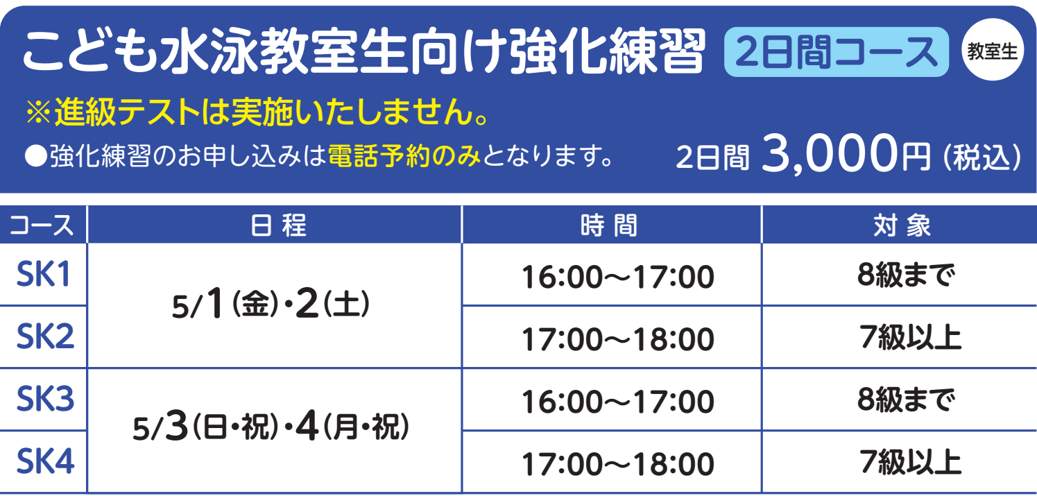 【教室生向け】こども水泳教室生向け強化練習(5/1~5/2・5/3~5/4)参加者募集中!※今回、進級テストは実施いたしません。