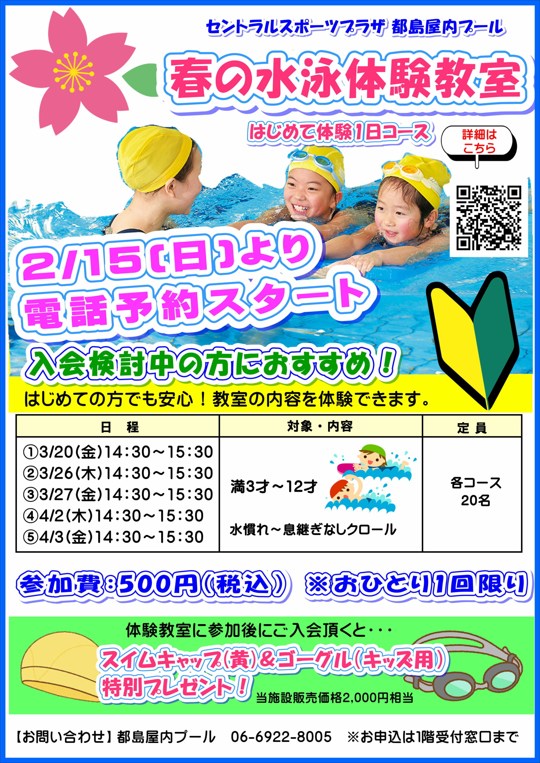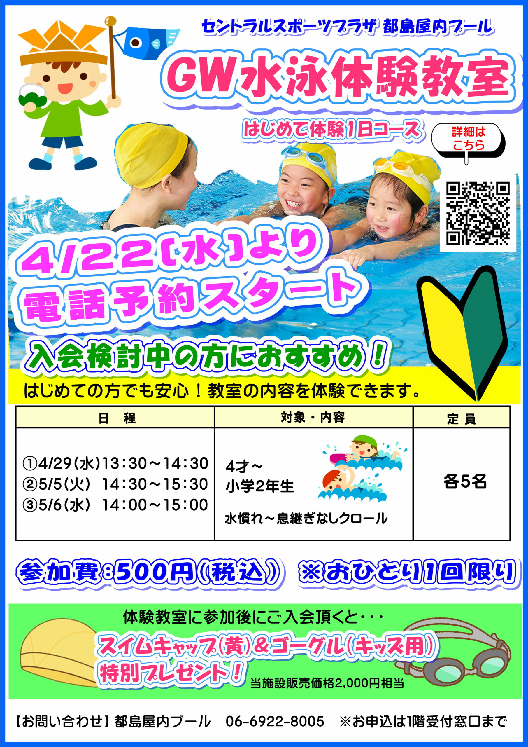 【4/22申込開始】「GW水泳体験教室」のお知らせ 2026/04/14 ゴールデンウィーク期間限定で「はじめて体験コース」開催予定です。おひとり1回限定!500円(税込)でご参加が可能!5月以降のご入会を検討される皆さんにオススメです。「通常クラス体験1日コース」はテスト期間を除き、随時受付中です。体験をご希望の方は、お気軽にお問合せ下さいませ。