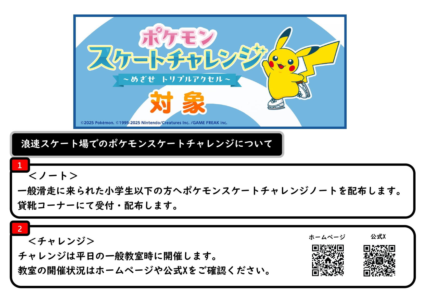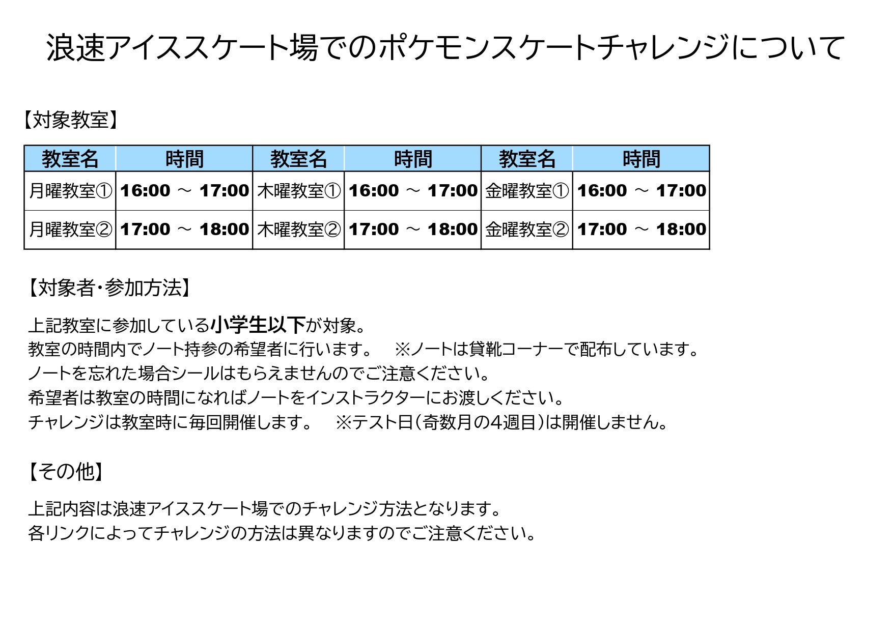 【アイススケート】ポケモンスケートチャレンジ開催 2025/06/23 ポケモンスケートチャレンジを6月30日(月)より開催します。チャレンジは平日一般教室内で行います。※教室に在籍している小学生以下が対象になります。※対象教室以外ではチャレンジはできませんのでご注意ください。ポケモンスケートチャレンジについてはこちらをご確認ください。浪速アイススケート場でのチャレンジの詳細は下記画像を参照ください。