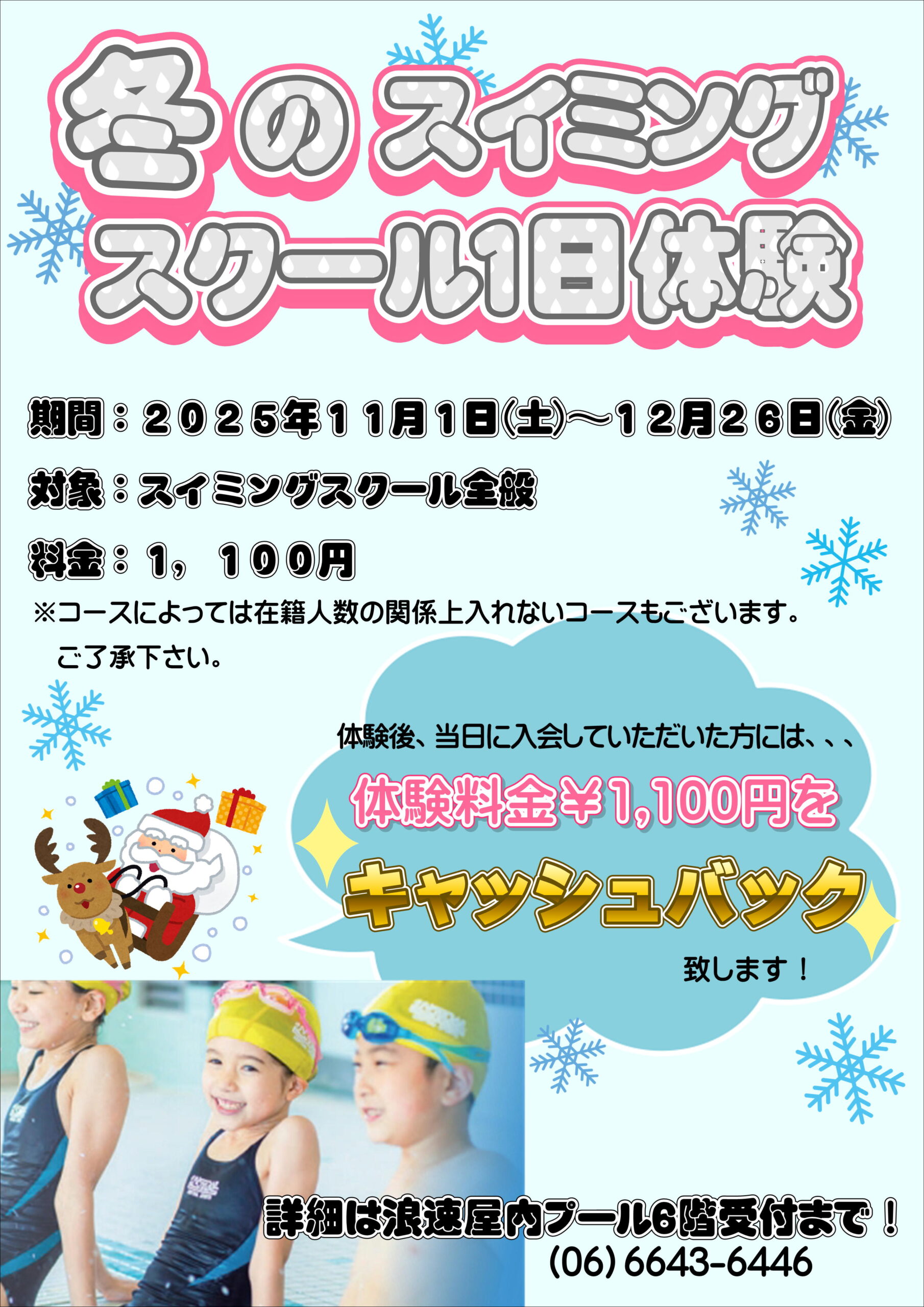 【スイミング】冬のスイミングスクール1日体験 キャッシュバックキャンペーン!随時受け付けております!