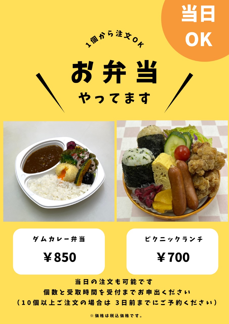 【レストランより】当日注文OK!お弁当 やってます! 2026/03/01 忍頂寺スポーツ公園のレストランで、お弁当の予約が出来ること、ご存じですか???レストランもいいけど、お外でランチも良いですよ!「ダムカレー弁当」と「ピクニックランチ」なら、当日予約も可能です。テニスや野球の休憩時に、お弁当はいかがですか?(10個以上ご注文の場合は、3日前までにご予約ください)ぜひ、ご利用ください!!
