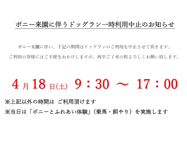 インフォメーション 【お知らせ】 4/18(土) ドッグラン 利用中止のおしらせ 2026/04/02 イベント実施に伴い、ドッグランの利用を中止させて頂きます。ご理解・ご協力を、お願い致します。 一覧へ戻る