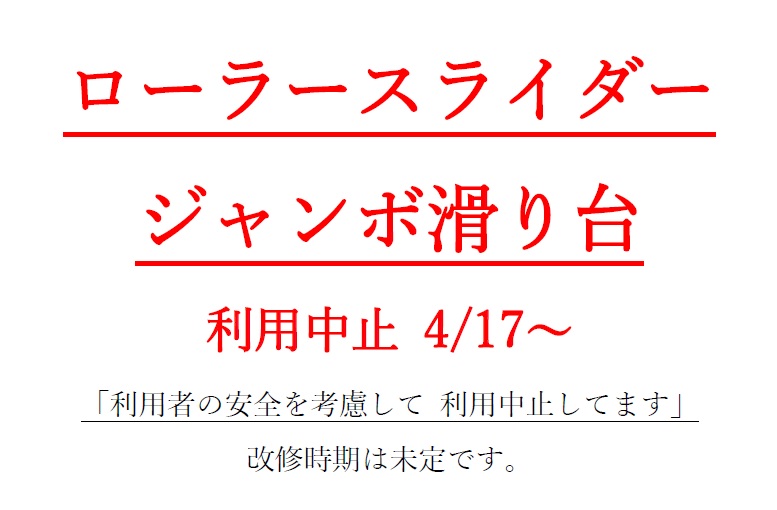 【お知らせ】スライダーなど 一部遊具の利用中止について 2025/02/01 遊具点検の結果、老朽化の激しい遊具について利用中止とすることとなりました。ご理解・ご協力をお願い致します。【対象遊具】・ローラースライダー・ジャンボ滑り台(コンクリート製)