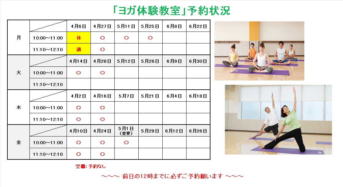 【4/10更新】日程変更あり 4月~6月「ヨガ体験教室予約状況