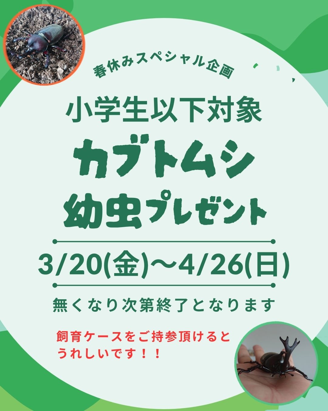 【小学生以下対象】残りわずか!カブトムシ幼虫 配布中!! 2026/04/11 残り少なくなって来ました!!只今、カブトムシの幼虫を無料配布中です!ご希望の方は、飼育ケースを持って、忍頂寺スポーツ公園へお越しください!!※予定数が無くなり次第 配布終了となります