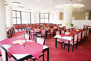 円状のデザインにより、パノラマの景色を観ながらお食事が楽しめる、明るくシックな色調の店内。ご宿泊や研修でご利用いただいたお客様はもちろん、スポーツやハイキングを楽しんだ後のお食事や、ドライブの途中のお食事など、様々な方にご利用いただけます。豊かな自然を背景に、旬の食材を利用した豊富なメニューをお楽しみください。