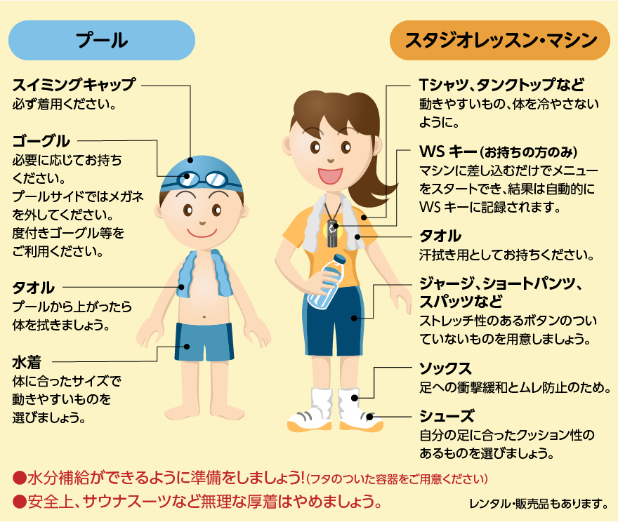 - 動きやすい服装(ストレッチ性のあるもの)と室内シューズ(運動ぐつのようなクッション性のあるもの)をご用意の上ご利用ください。